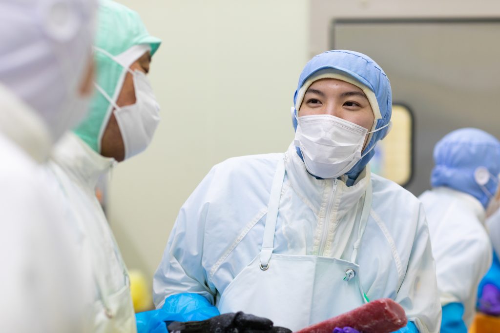 製品に直接触れる従業員のユニフォームは、ウェアラにお願いして、ポケットを潰してもらいました。ポケットのなかに物を入れたまま、工場に入ることがないように物理的な対処策として。それと、ユニフォームや帽子(フード)の色も、こだわっていますね。品質管理部などは、ユニフォームも帽子も白色ですが、製造現場の従業員は、サックス(水色)を採用しています。取り扱っている冷凍マグロに含まれる黒・赤・白系の色ですと、その色の糸などが付着した場合に発見が難しくなってしまうことから、水色を選びました。