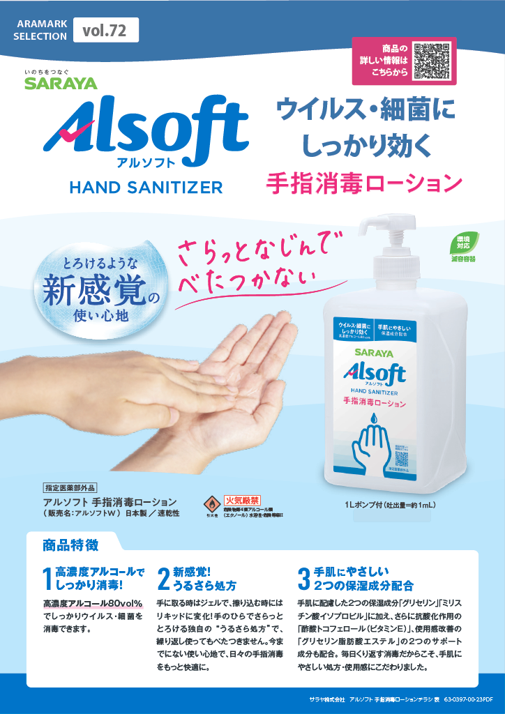 今回ご紹介のアルソフトは、ジェルタイプ手指消毒剤のネガティブ面を改善、速乾性があり、さらっと馴染んでべたつかない、ローションタイプとなっております。